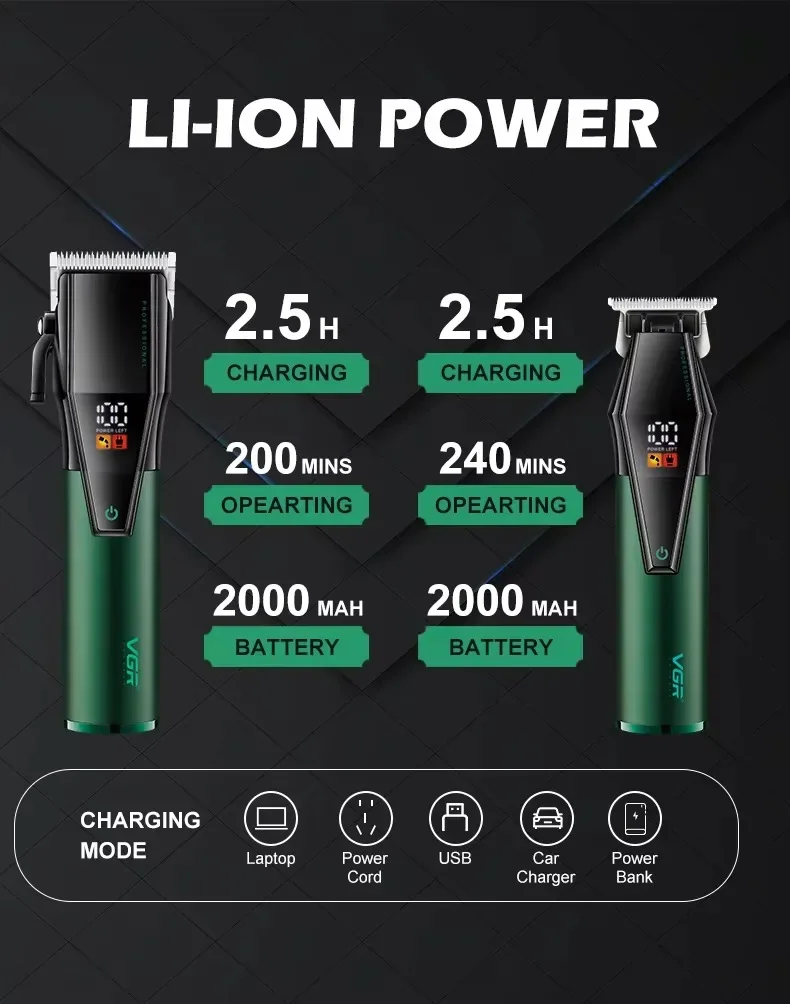 Experience precision grooming with the VGR Hair Trimmer, featuring a durable stainless steel blade and a high-capacity battery for up to 200 minutes of cordless use.
